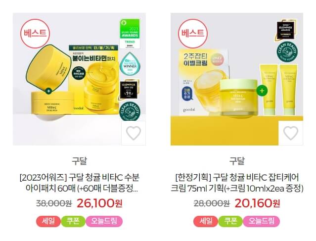 구달의 청귤 수분 아이패치와 잡티 케어 크림이 나란히 이번 올영 세일 제품에 포함되었습니다. 마스크 착용으로 인해 눈가 잡티가 늘어났다는 통계도 있는데요. 또한 노화로 인한 눈가 잡티를 이번 기회에 제거해보시는 건 어떨까요?