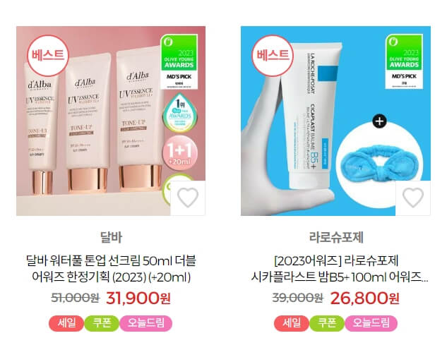 피부과 의사가 추천하는 피부를 지키는 첫번째 원칙은 선크림입니다. 유명한 배우들도 피부 잡티 생성을 억제하기 위해 필수적으로 선크림을 꼼꼼하게 바른다고 하는데요. 달바의 촉촉한 톤업 선크림이 올영 세일에서는 2만 원 저렴하게 구매가 가능합니다. 또한 보습으로 유명한 라로슈포제 시카 플라스트 밤 제품도 올영 세일에서 13,000원가량 할인된 가격으로 판매됩니다.