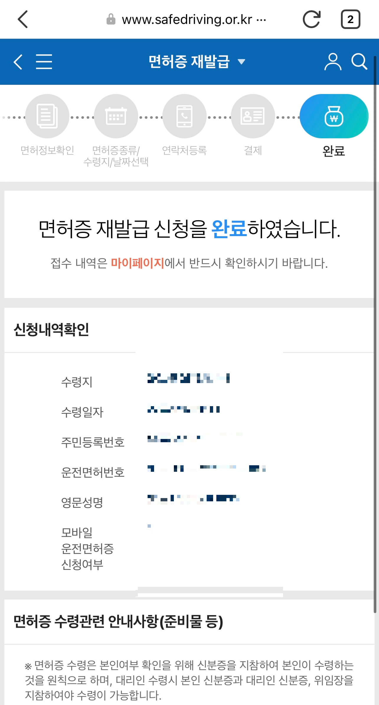 운전 면허증 재발급 신청을 완료하였습니다. 하는 페이지까지 오면 카카오톡으로 신청 완료 알림이 옵니다. 여기까지 하시면 신청이 정상적으로 처리된 것입니다. 운전면허증이 재발급되는 시점까지는 주민등록증이나 여권 등의 신분증을 대신 사용하시면 되겠습니다.