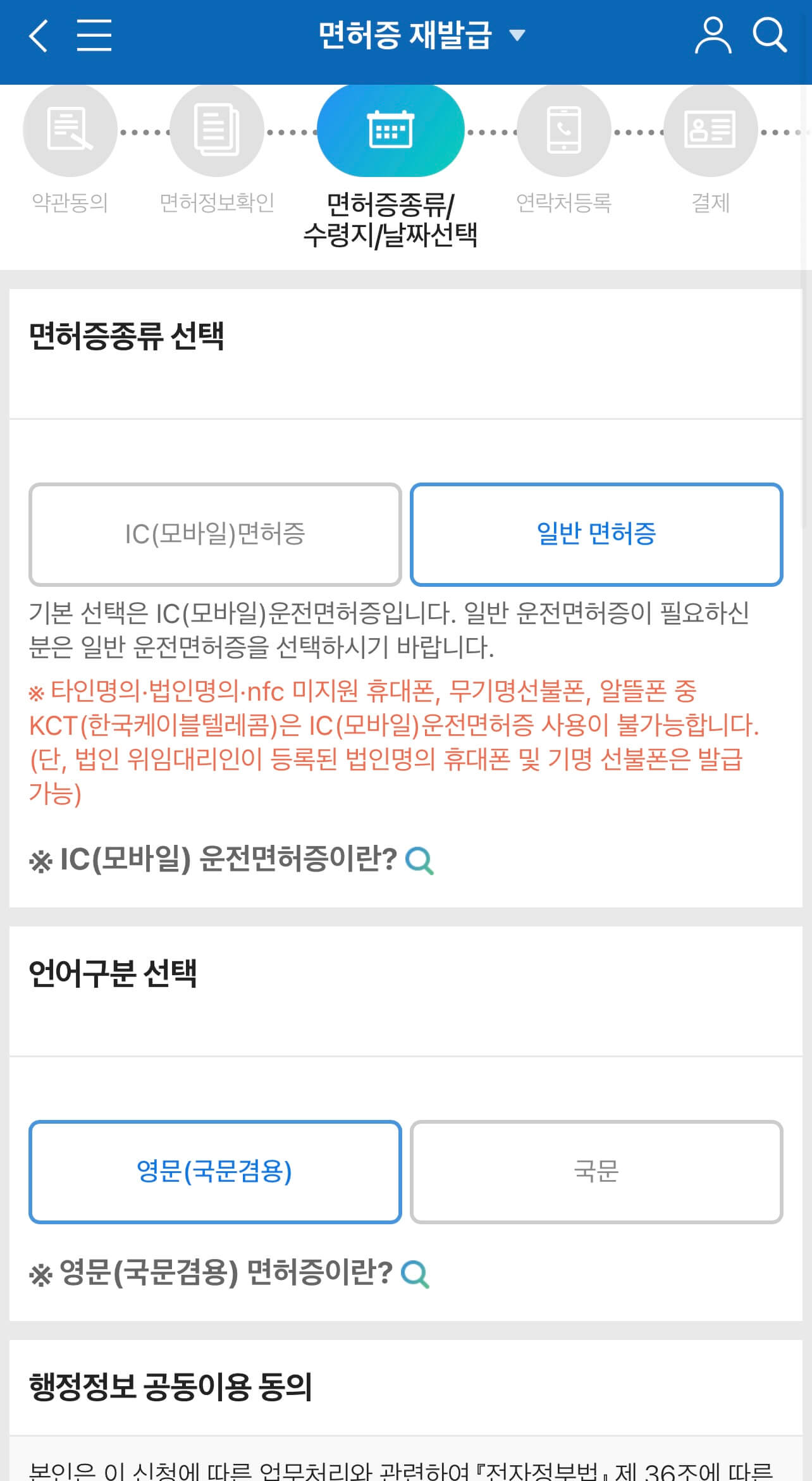 6. 면허증 종류와 언어구분, 수령날짜를 선택합니다. 재발급해서 신청한 곳에 도착하게 되면, 문자가 오긴 합니다. 제가 신청한 날짜로 부터 3주 정도 걸리네요. 시간을 넉넉하게 잡아야겠습니다.