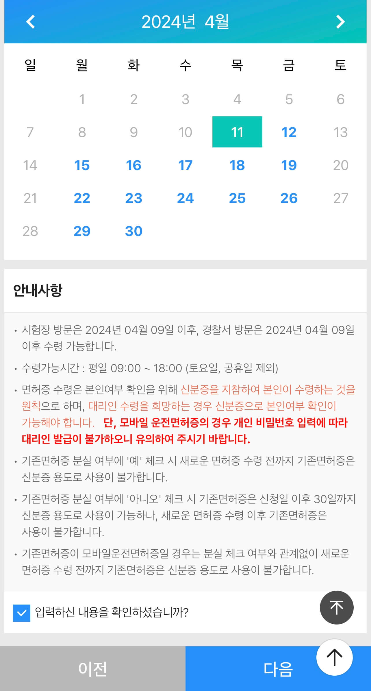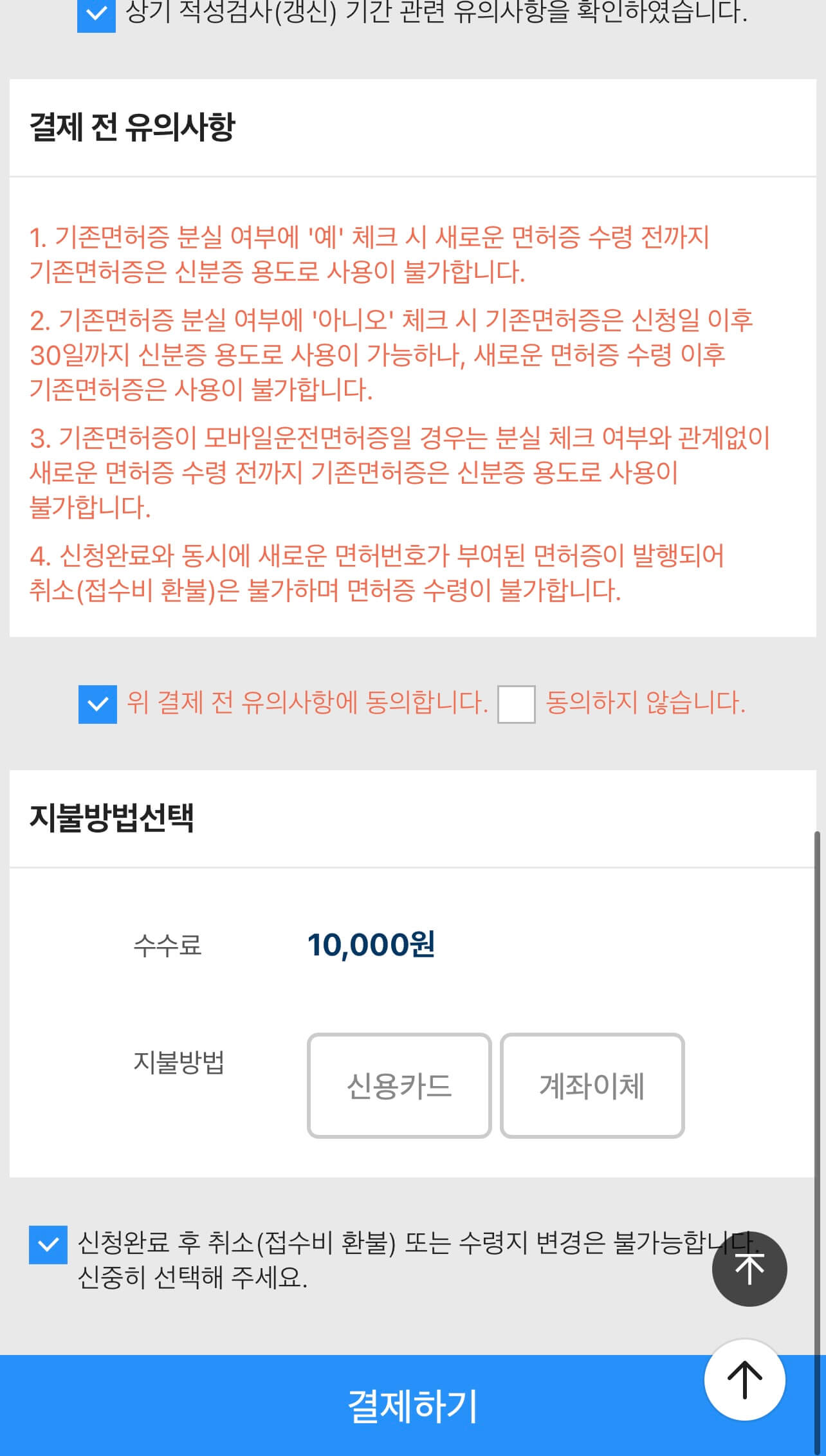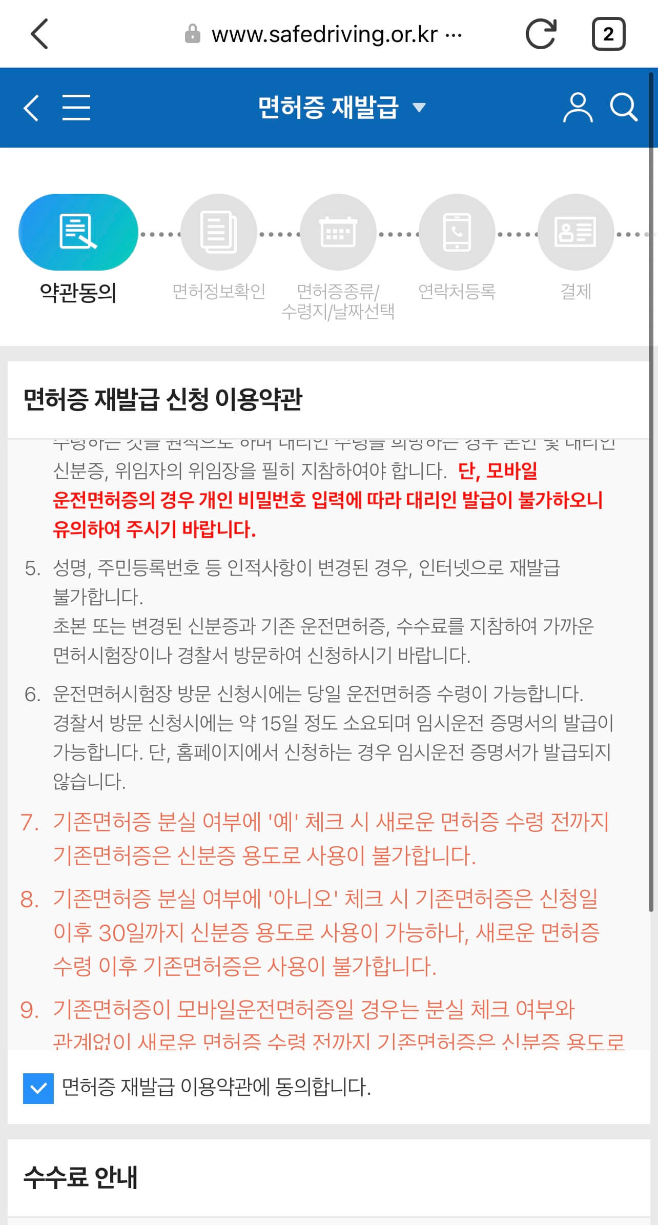 4. 본인 인증이 끝나면 본격적으로 운전면허증 재발급 절차가 시작됩니다. 약관 동의와 수수료 안내 동의를 해주시면 다음 단계로 넘어가게 됩니다.