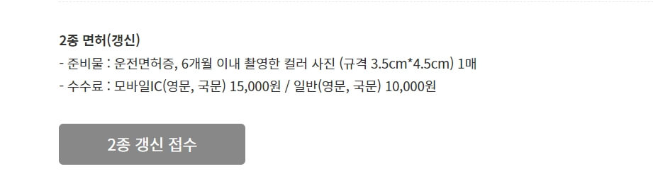 화면 하단부 쪽에 2종 면허 갱신에 대한 수수료가 나옵니다. 모바일 IC 추가는 15000원, 일반은 만원입니다. 2종 갱신 접수를 눌러서 진행하시면 됩니다. 모바일은 기본 카드형에다가 추가로 핸드폰에 저장해서 쓸 수 있기 때문에 편리하다는 장점이 있습니다. 갱신기간이 경과 후에는 과태료 2만원이 추가 부과됩니다.