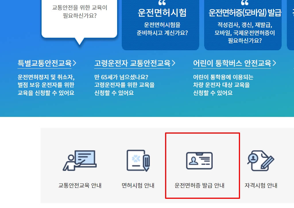먼저 도로교통 공사 홈페이지에 들어가시면 화면 아랫부분에 운전 면허증 발급 안내란이 있습니다. 이 부분을 클릭하시고 들어가세요.