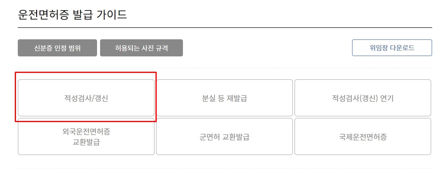 그 다음에 적성검사와 갱신 버튼을 누르시면 됩니다. 참고로 2종 면허는 적성검사가 면제된다는 사실을 기억해 주세요.