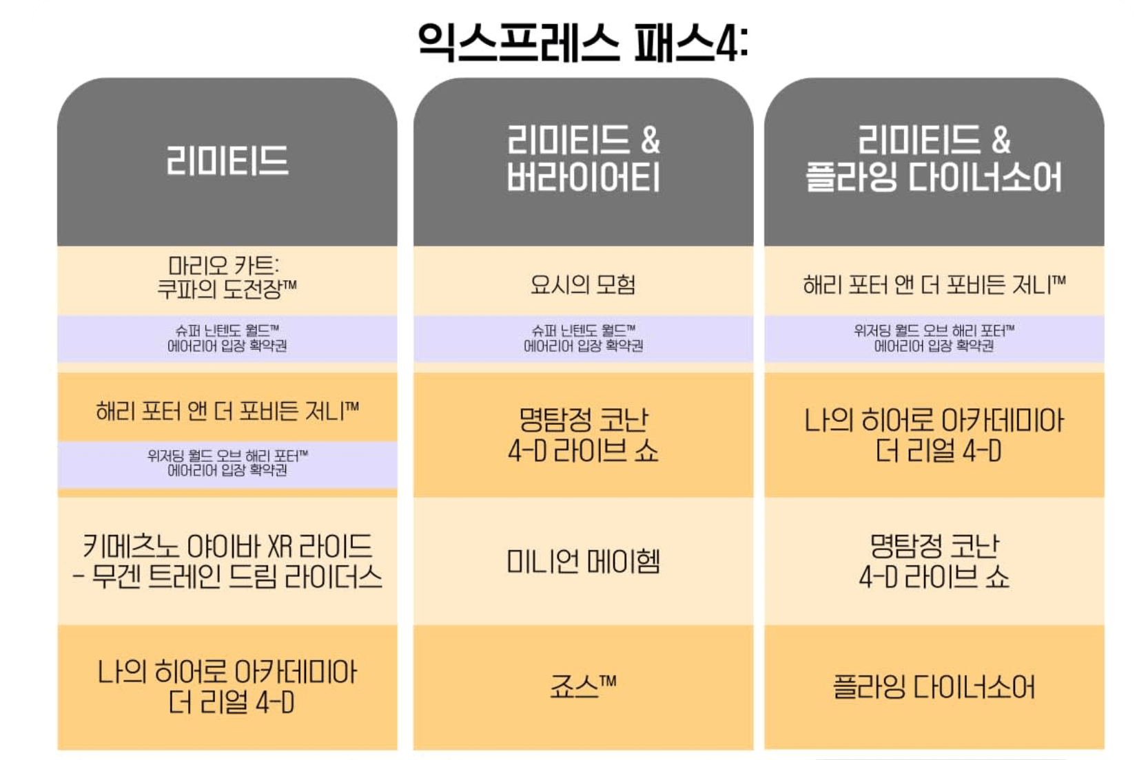 익스프익스프레스 패스에는 확약권이 붙어 있어 따로 구매하지 않아도 익스프레스 패스 4 가 많이 선호되는 편입니다. 자세히 보면, 익스프래스 패스에는 입장 확약권이 붙어있는데, 리미티드 & 플라잉 다이너소어와 리미티드 버라이어티에는 닌텐도 입장 확약권이 없습니다. 따라서 슈퍼 닌텐도 월드에 입장을 원하시는 분은 이 외의 익스프레스 패스를 구매하셔야 입장이 가능하다는 사실을 기억하세요!