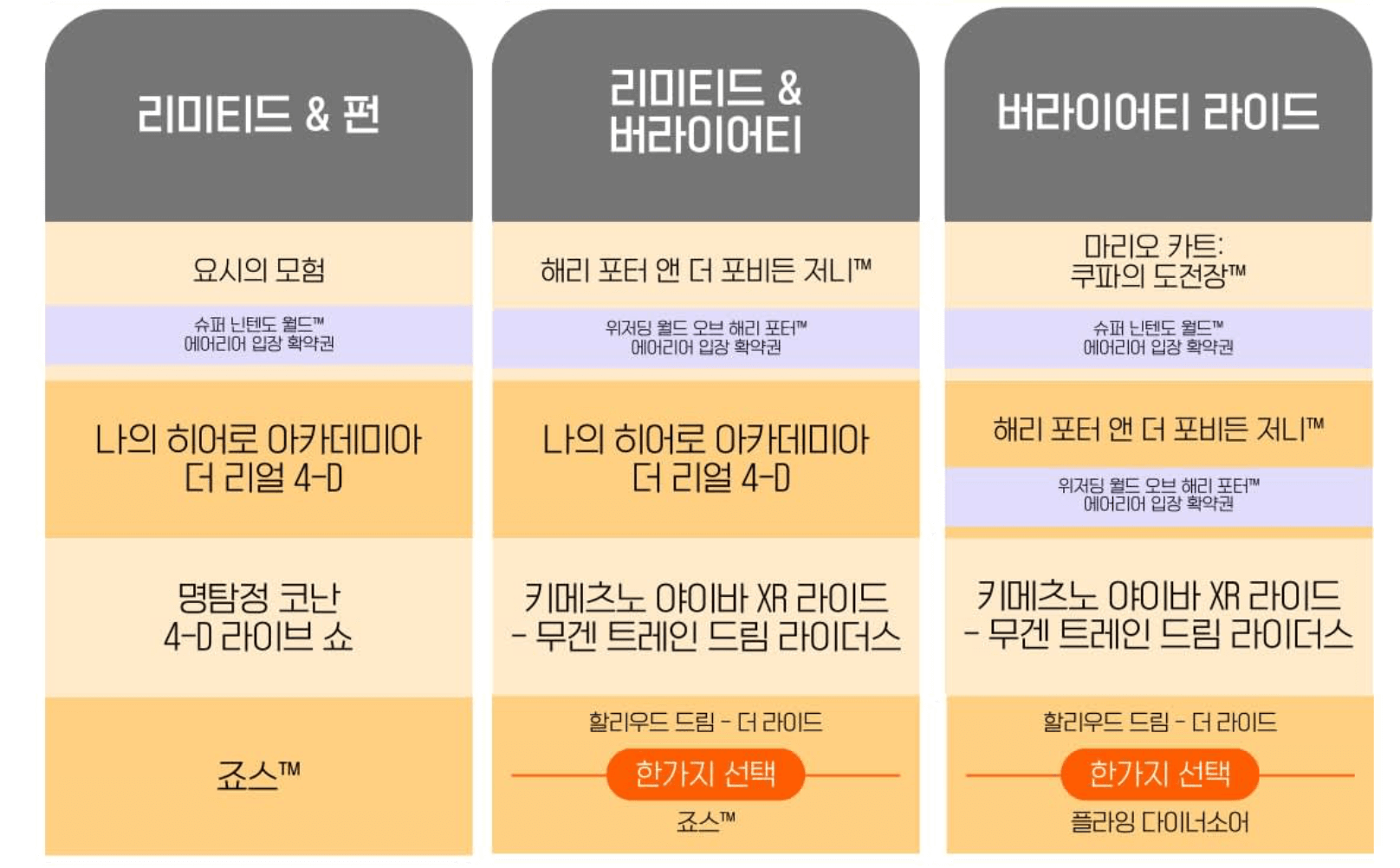 익스프익스프레스 패스에는 확약권이 붙어 있어 따로 구매하지 않아도 익스프레스 패스 4 가 많이 선호되는 편입니다. 자세히 보면, 익스프래스 패스에는 입장 확약권이 붙어있는데, 리미티드 & 플라잉 다이너소어와 리미티드 버라이어티에는 닌텐도 입장 확약권이 없습니다. 따라서 슈퍼 닌텐도 월드에 입장을 원하시는 분은 이 외의 익스프레스 패스를 구매하셔야 입장이 가능하다는 사실을 기억하세요!