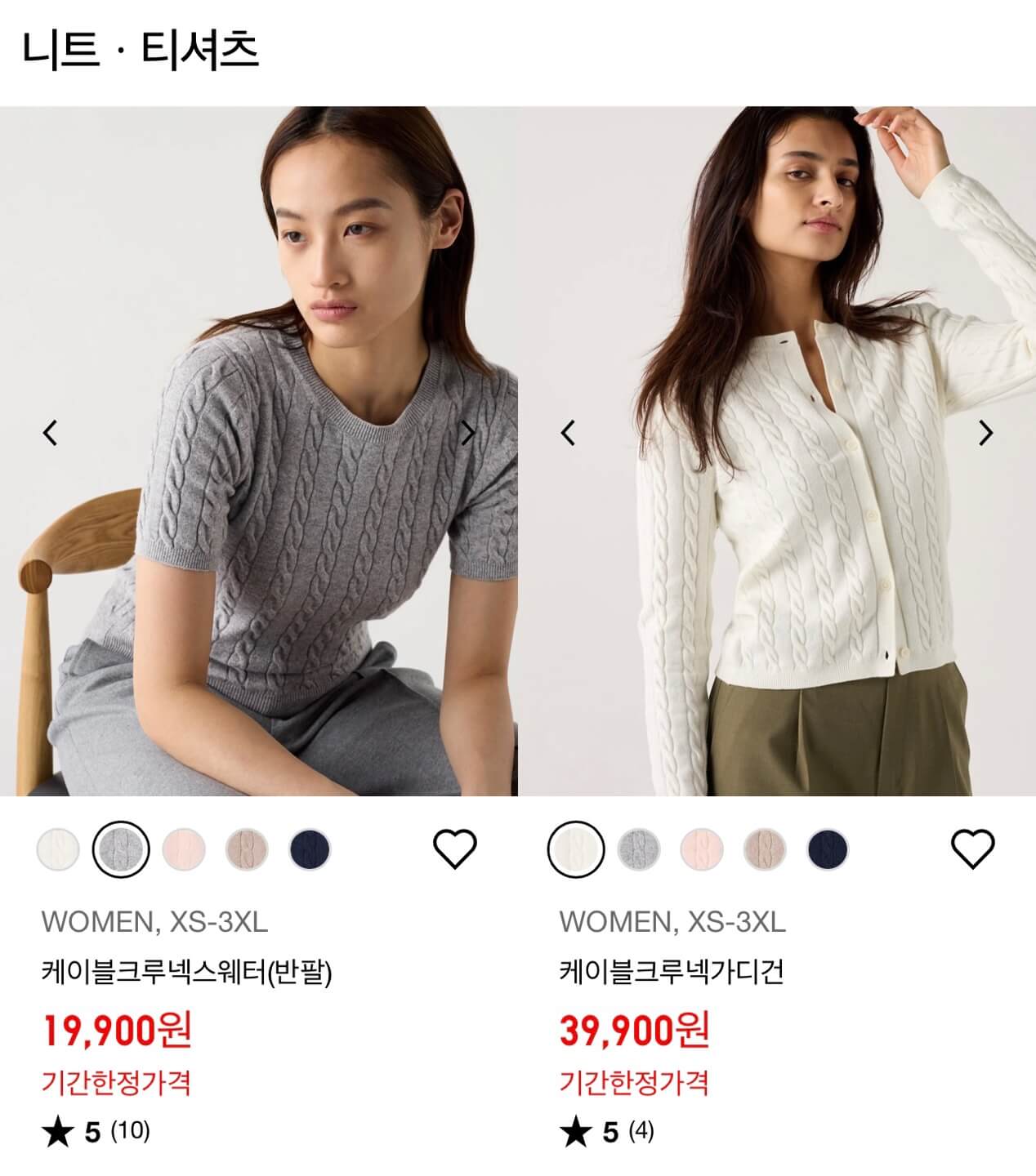 추석맞이 세일기간에는 편하게 입을 수 있는 게이블 크루넥스웨터 반팔 제품이 19,900원에 구매할 수 있으며, 긴팔 크루넥 가디건도 39,900원에 구매가 가능합니다. 개인적으로 반팔 스웨터가 다소 합리적인 가격이라고 생각됩니다.