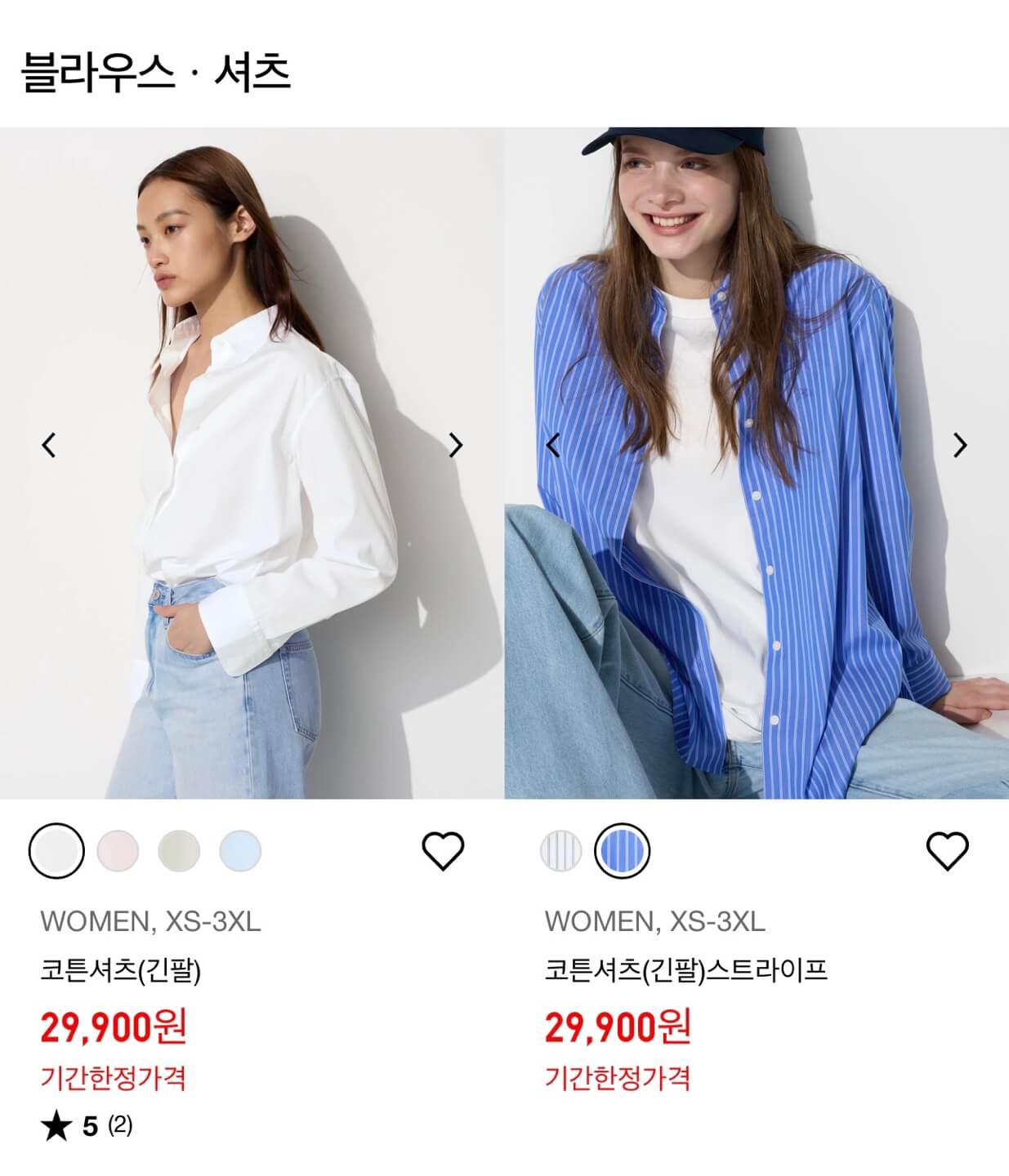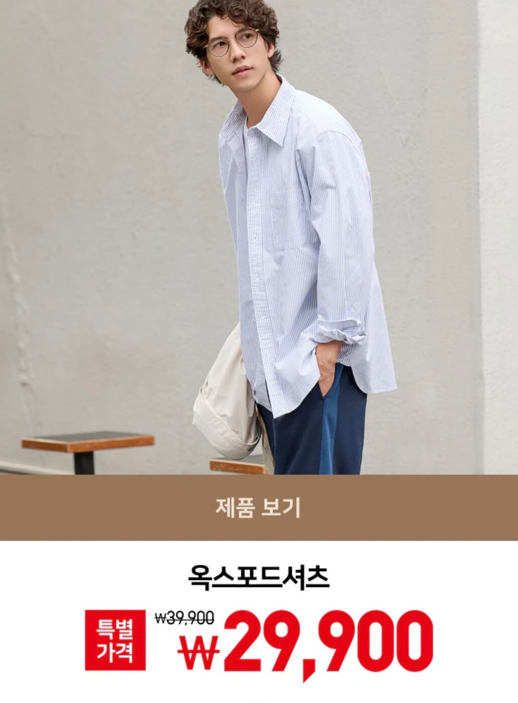 국민셔츠인 코튼셔츠도 기간 한정으로 세일에 들어가는데요. 단색의 셔츠와 스트라이프 종류로 나누어져 있습니다. 흰 티 위에 걸쳐서 코디하기엔 색이 짱짱한 블루 스트라이프 코튼 셔츠가 나을 것 같네요.