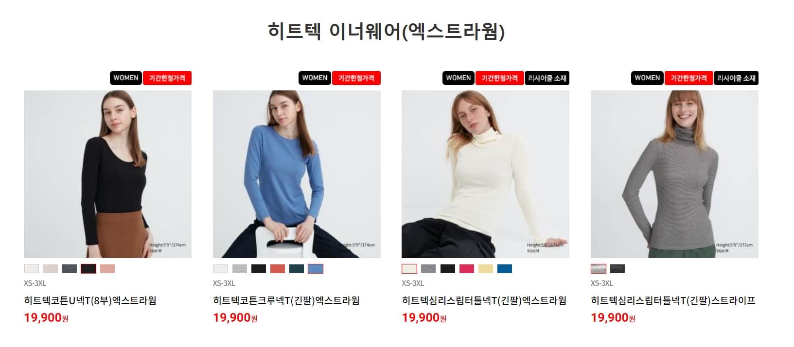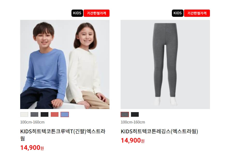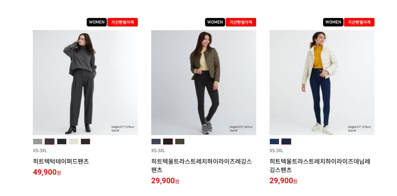 여성과 남성 그리고 키즈 상품까지 히트텍 이너웨어, 바지 등이 전부 세일제품에 들어갔습니다. 저희 집도 꽤 보유하고 있는 히트텍 정말 따뜻합니다.