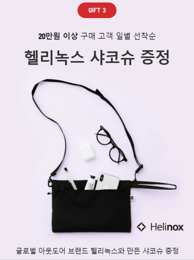 20만 원 이상 고객에게는 선착순으로 헬리녹스 샤코슈를 증정합니다. 샤코슈란 프랑스어로 가방을 의미하는 것으로, 다양한 스타일에 어울리는 활용도 높은 가방입니다. 헬리녹스는 아웃도어 캠핑용품으로 유명한 업체로, 이번 유니클로 감사제 이벤트에서는 유니클로와 헬리녹스의 협업으로 탄생한 가방을 증정합니다.