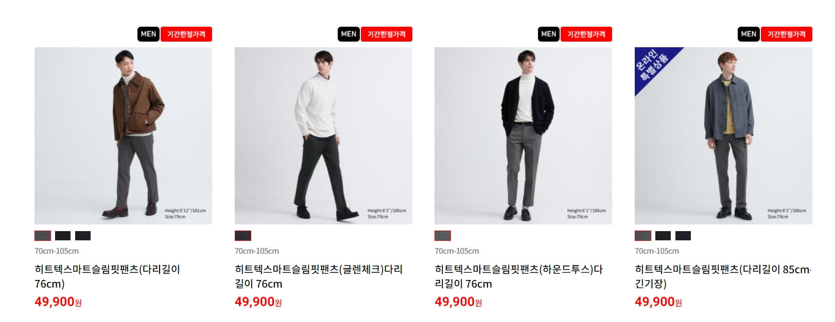 또한 이너웨어용 히트텍 뿐만 아니라 출퇴근용을 위한 히트텍 바지가 세일 중입니다. 추운 겨울 대비용으로 하나씩 장만하셔도 좋을 듯싶습니다.