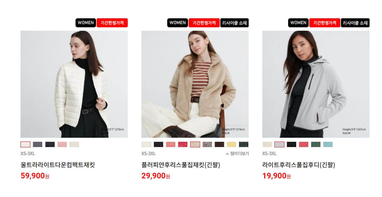 아우터도 세일에 들어갔는데요. 울트라라이트다운콤팩트 재킷은 얇으면서도 보온성이 뛰어나서 꾸준히 사랑받는 제품입니다. 혹한기에도 이 패딩을 입으면 따뜻하다는 평이 대부분입니다. 라이트 플리스 풀집후디는 저도 얼마 전에 구매한 상품입니다. 아래 상품 후기를 첨부해 놓을 테니 참고하세요!