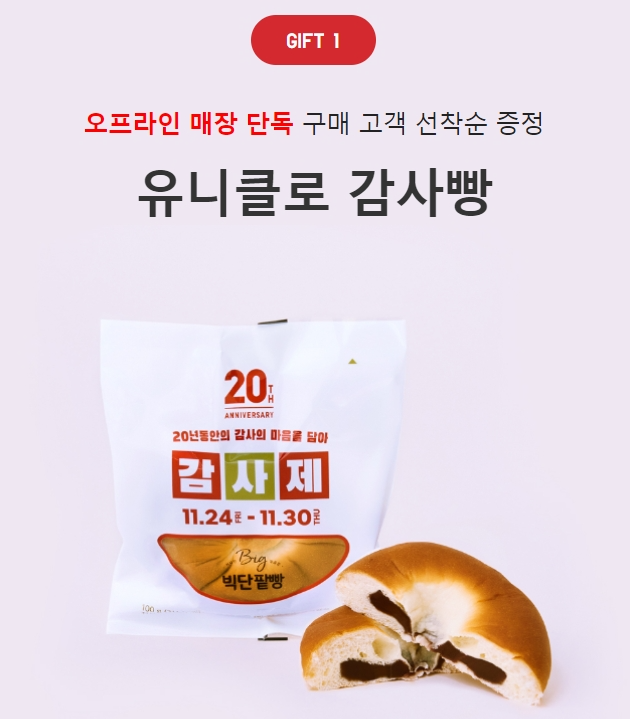 유니클로 오프라인 매장 단독으로 구매고객 선착순 20만 명에게 감사빵을 증정합니다. 이름하여 빅단팥빵입니다. 옷도 사고 빵도 받고 일석이조입니다.