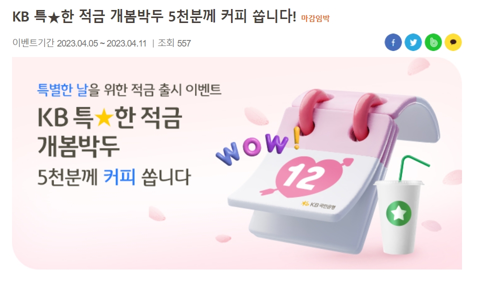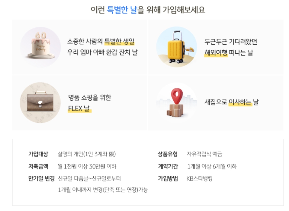 가입방법은 KB스타뱅킹을 통해 1인이 최대 3계좌까지 가능하며, 가입금액은 최소 월 천 원 이상 30만 원 이하, 계약기간은 1개월~ 6개월 이하입니다. 현재 모바일 KB스타뱅킹에서 특별한 적금 가입 알림신청을 하시면 추첨을 통해 스타벅스 커피쿠폰을 지급 이벤트를 진행 중입니다.