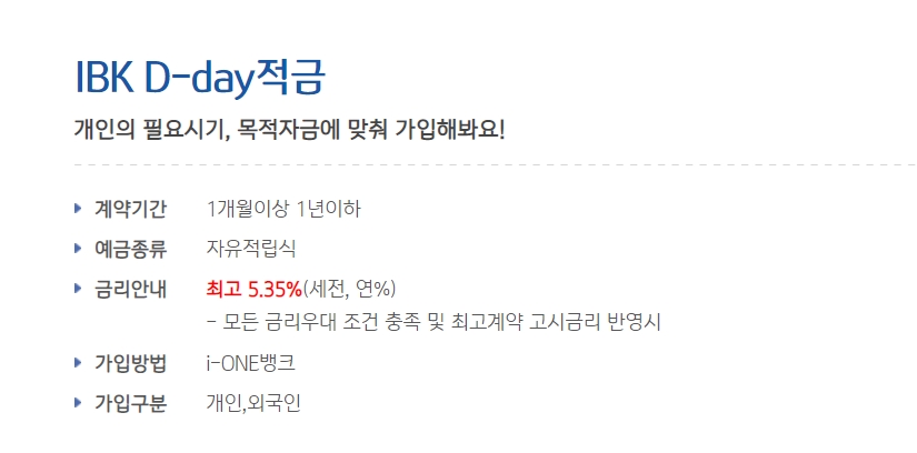 우대금리는 상품가입 시 설정한 목표금액 이상을 납입하고, 계약기간 중에 3회 이상 기업은행을 통한 자동이체 기록이 있으면 목표달성 축하금리 연 1.0%포인트를 받을 수 있습니다. 첫 거래 고객은 연 0.5%포인트의 금리가 추가 적용되어 계약기간이 12개월인 경우 최고 5.35%의 금리를 받게 됩니다. 기업은행 또한 디데이적금 가입고객 중 추첨을 통해 500명에게 이디야 커피 쿠폰을 제공하는 이벤트를 진행 중입니다.
