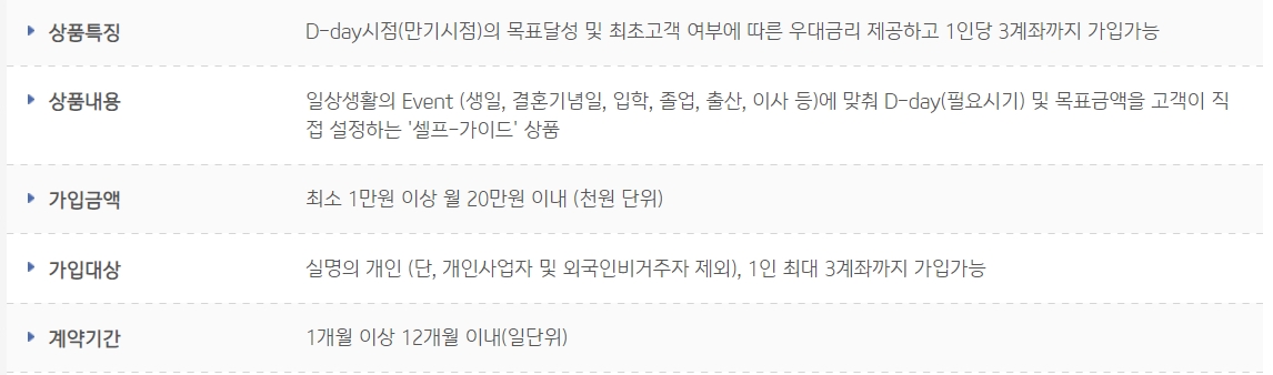 | 저축금액 | 천원~30만원 이하 | 천원~50만원 이하 | 만원~20만원 이하 |