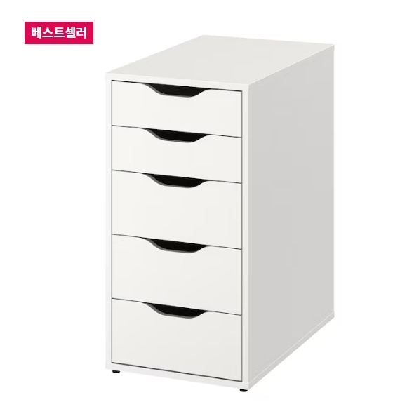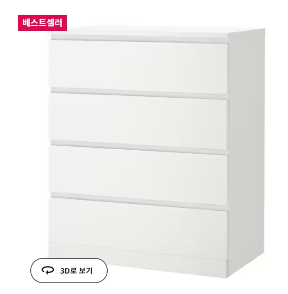 심플한 디자인에 이케아를 대표하는 가성비 좋은 서랍장입니다. 넉넉한 수납공간을 자랑하면서도 견고하며 서랍도 부드럽게 열리는 특징을 지닙니다.