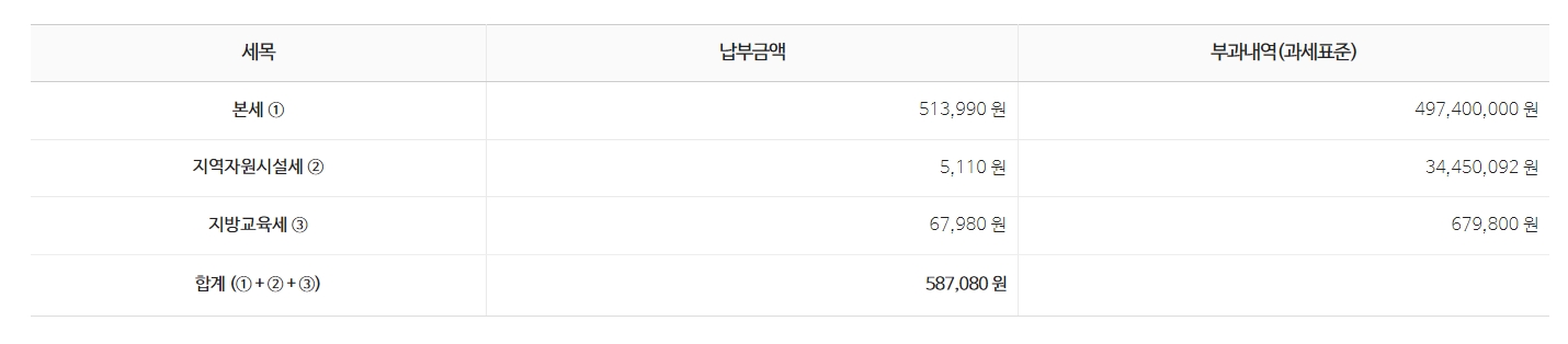 본세는 위에서 언급한 공동주택가격X60%X세율로 산정된 금액입니다. 여기에 지역자원시설세와 지방교육세가 더해져서 총재산세가 산정됩니다.