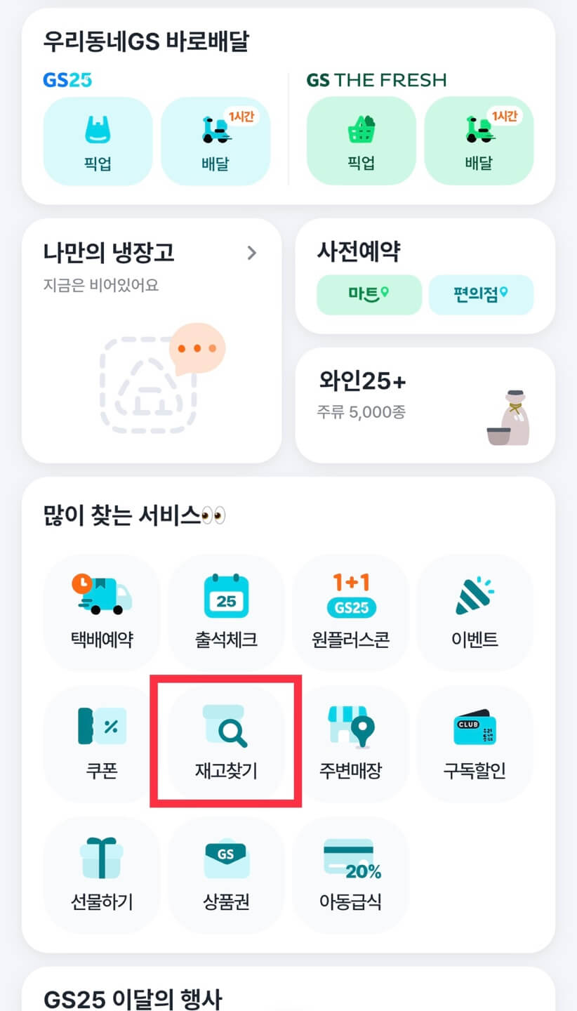 1.우리동네 GS 앱을 실행시키면 메인 화면에 <재고 찾기> 버튼을 누릅니다.