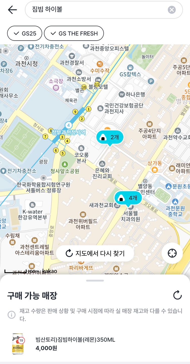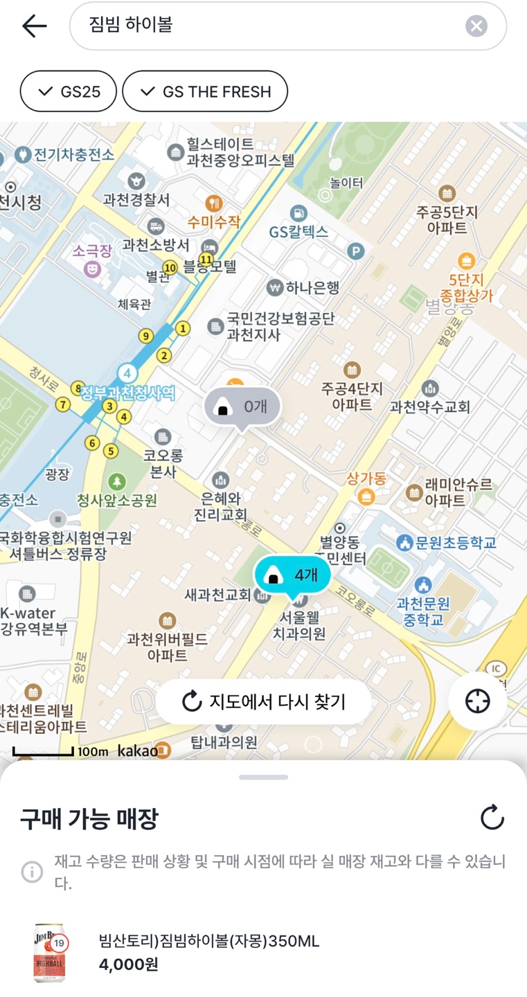 편의점 별로 짐빔 하이볼의 재고를 찾는 것은 다소 번거로운 일입니다. 하지만, 어플을 활용하면 보다 간단하게 확인이 가능합니다. 대표적으로 우리동네 GS 어플을 이용하여 알아보도록 하겠습니다. 참고로 짐빔 하이볼의 가격은 개당 4천원이며 4개 구매시 12,000원에 판매되고 있습니다.