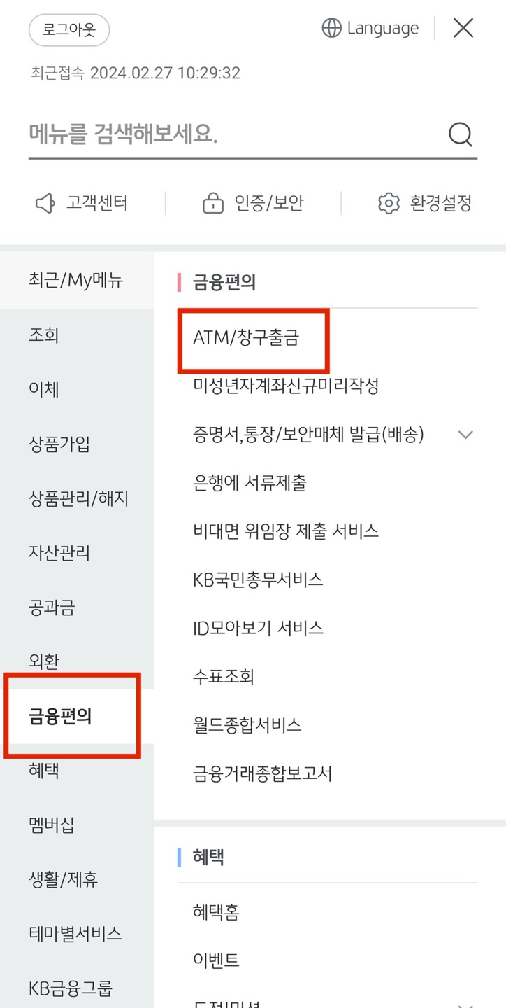 메뉴 탭에 들어왔으면, 금융편의-ATM/창구출금을