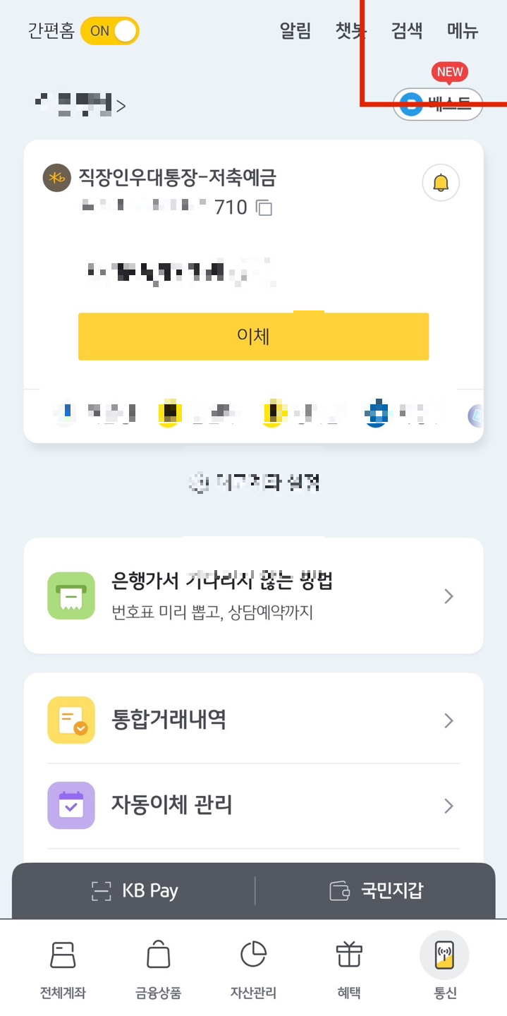 먼저 모바일에 있는 스타뱅킹 앱으로 로그인을 합니다. 화면 상단 오른쪽에 메뉴 탭을 클릭합니다.
