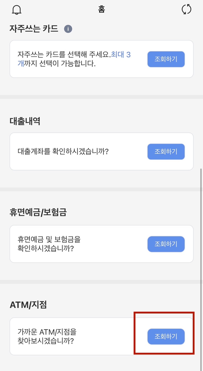 그 후에 하단을 보시면 ATM/지점 란이 있습니다. 조회하기를 눌러주세요.