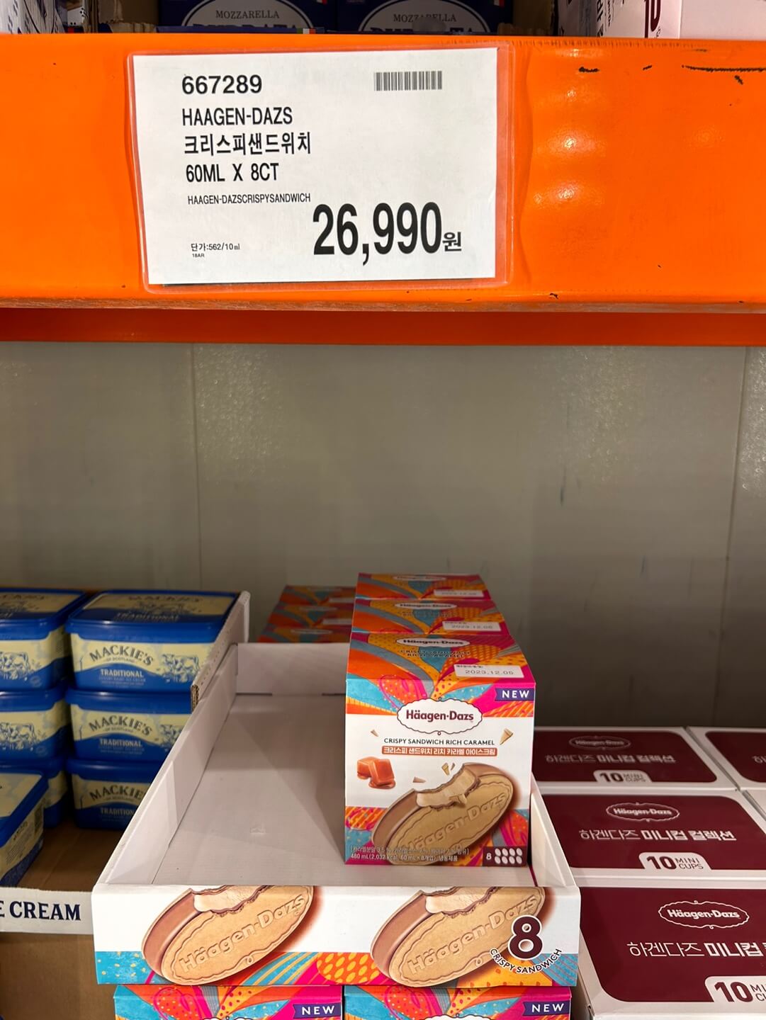 하겐다즈 크리스피 샌드위치는 달달한 캬라멜 맛을 좋아하시는 분들에게 정말 추천드리는 상품입니다. 한때 우리나라에서도 판매가 되다가 어느 순간 판매가 중지되었습니다. 60ml 샌드위치 8개가 들어있는 이 구성은 개당 가격이 약 3400원으로 20년 전 가격과 크게 다르지 않습니다.