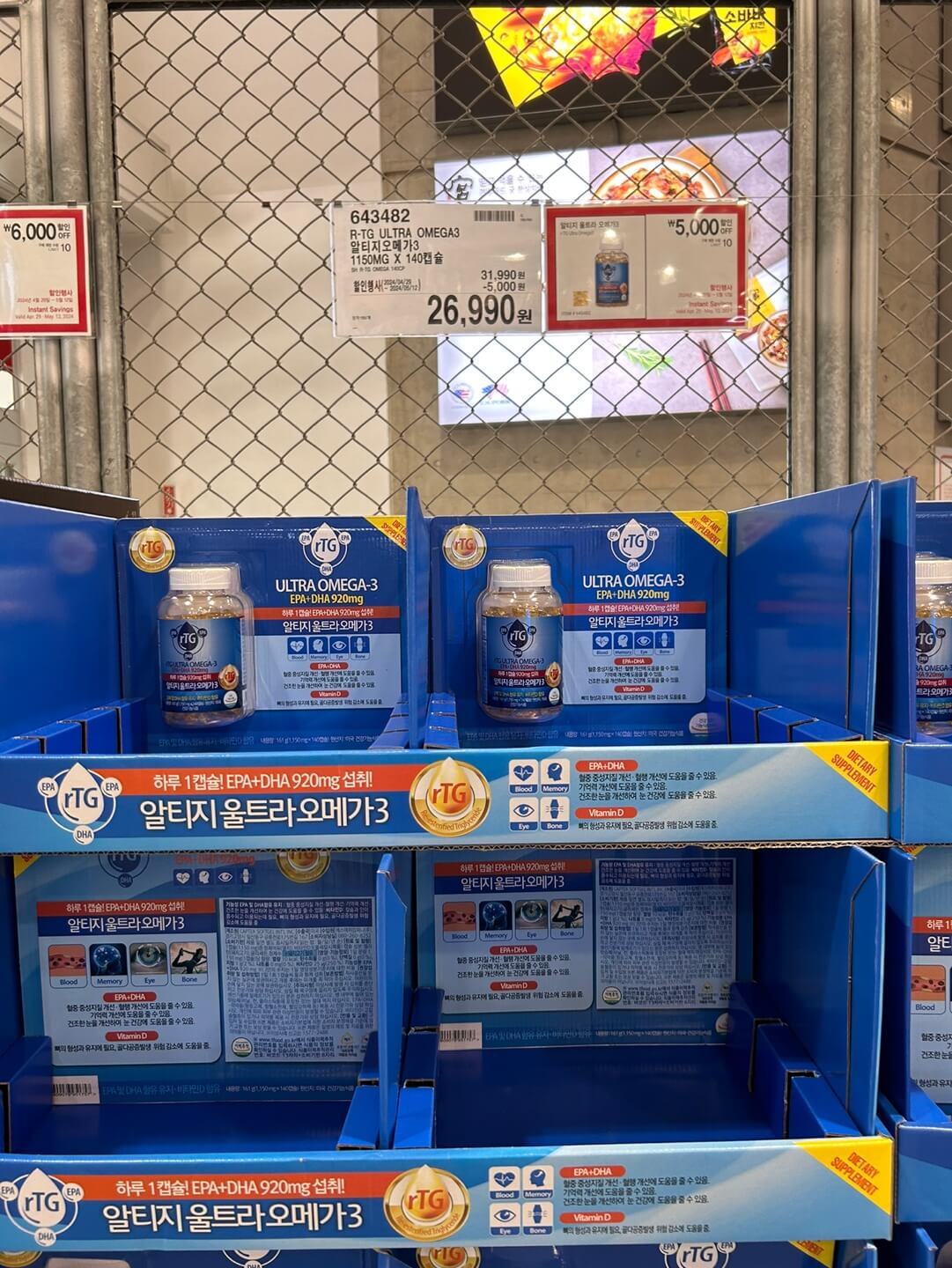 부모님께 드릴 어버이날 선물로 안성맞춤인 제품은 뭐니 뭐니 해도 영양제입니다. 광명 코스트코에서는 정관장 홍삼정 현을 6천 원 할인한 30,990원에 5월 12일까지 판매하고 있습니다. 알티지 오메가 3 제품도 5천 원 할인한 26,990원에 판매 중입니다.