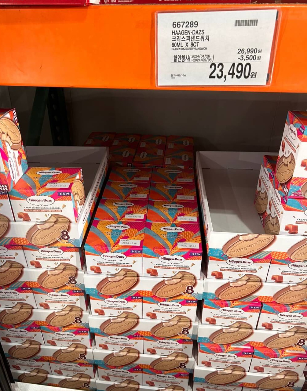 진한 캐러멜 향이 일품인 하겐다즈 크리스피 샌드위치도 3500원이나 할인된 23,490원에 판매되고 있었는데요. 8개 들입이라서 할인받으면 개당 가격이 3,000원도 채 하지 않습니다. 아이스크림 좋아하시면 꼭 사셔야 할 필수품입니다.