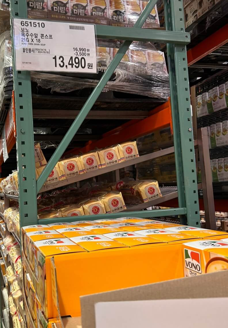 그냥 아침에 밥 먹기는 부담스럽거나 목이 칼칼할 때가 있습니다. 그럴 때 이 보노 수프가 딱인데요. 5초 만에 만들어지는 이 보노 스프는 일반 마트에서 대략 박스당 3,000원 이상에 판매되고 있는데요. 코스트코에서는 6박스에 13,490원이라는 초특가에 판매 중입니다. 개당 가격이 거의 2천원대 초반입니다. 보노 스프 다른 제품도 먹어봤지만 보노 옥수수알 콘수프가 제일 맛있다고 자부합니다. 할인행사는 5월 5일까지입니다.