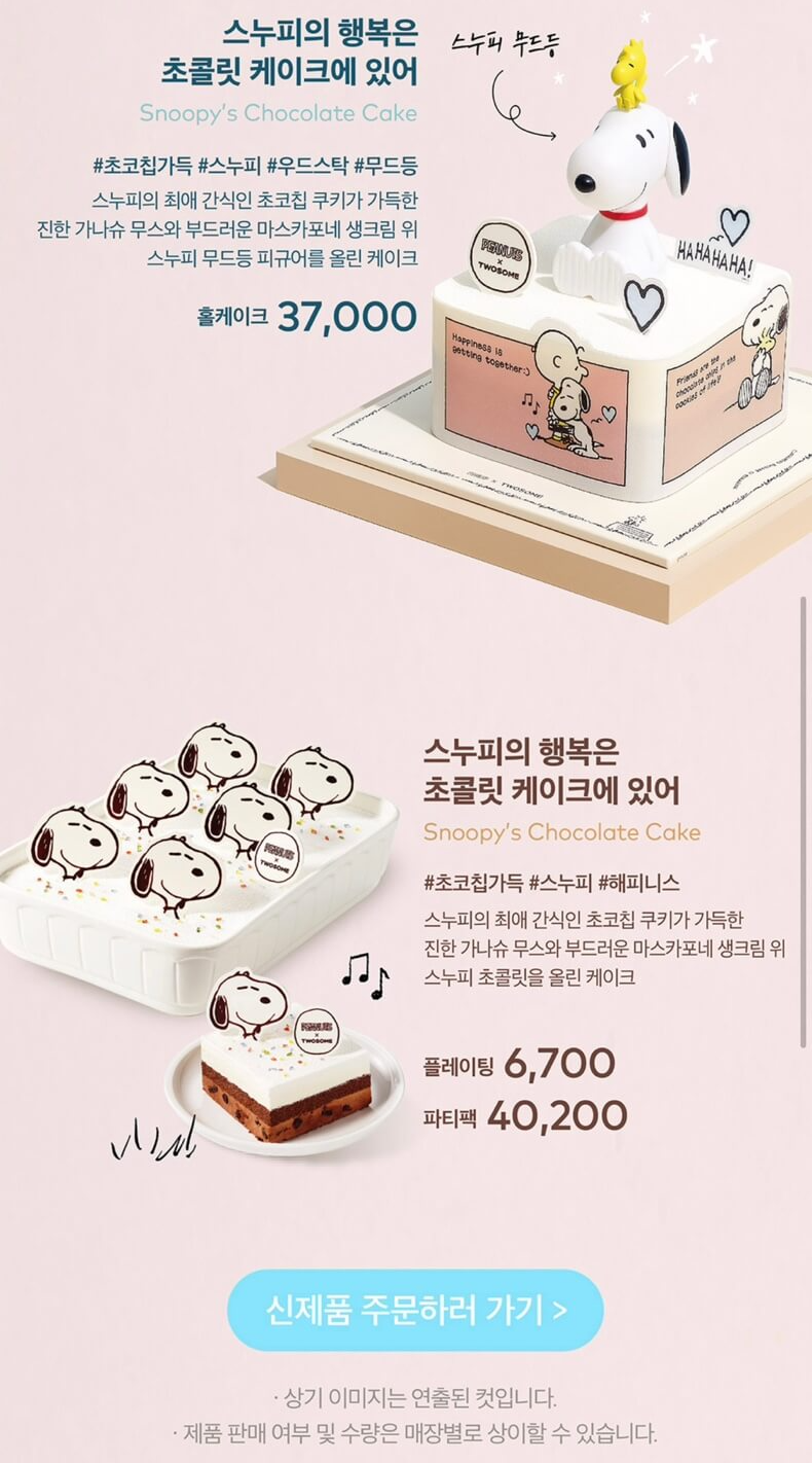 핑계고에서 보자마자 바로 사야겠다는 생각이 든 이 스누피 케이크는 초콜릿 케이크입니다. 가나슈 무스와 부드러운 마스카포네 생크림을 사용한 이 케이크의 맨 위에는 무드등으로 활용할 수 있는 스누피 피규어가 올려져 있습니다. 저희 집 꼬맹이 생일이 마침 내일이라 미리 예약을 해 두었습니다. 투썸 플레이스의 케이크 맛은 평타 이상일 것이고, 이렇게 이쁜 디자인이라면 마다할 이유가 전혀 없다는 생각이 들었습니다. 이 스누피 홀케이크 가격은 37,000원입니다.