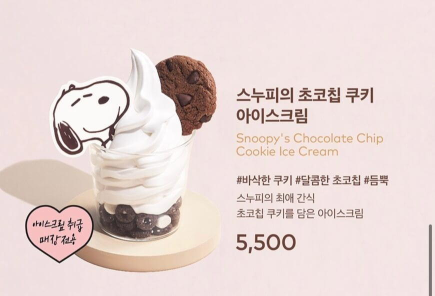아이스크림 매장 전용 상품인 스누피의 초코칩 쿠키 아이스크림은 오레오 위에 소프트 아이스크림 그리고 달달한 초코칩 쿠키로 토핑을 한 디저트입니다. 한방에 당 충전이 될 것만 같은 이 제품의 가격은 5500원입니다.