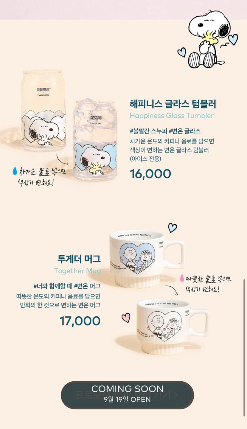 9월 19일부터는 스누피와 콜라보한 제품들도 만나보실 수 있습니다. 먼저, 차가운 물을 넣으면 색상이 변하는 해피니스 글라스 텀블러입니다. 이 변온 글라스는 아이스 전용 제품으로 뜨거운 온도의 음료를 담으시면 안 됩니다. 가격은 16,000원으로, 아이스 음료를 즐기시는 분들에게는 안성맞춤인 상품입니다.