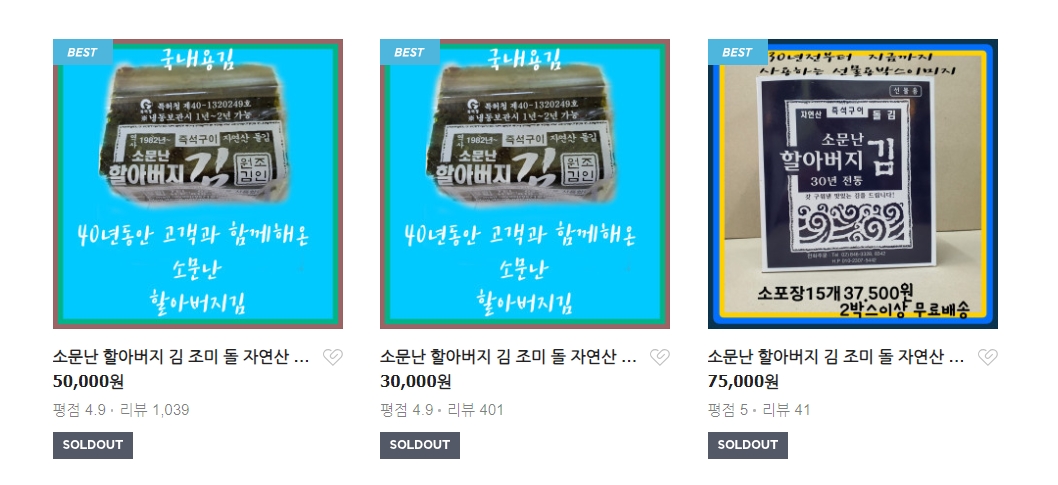 한효주가 언급한 내용 중에는 제품의 전체 이름이 아닌 소문난 할머니 김이라는 힌트만 있었습니다. 소문난 할머니 김으로만 검색해보니 할머니가 아닌 할아버지 김이 나왔습니다. 몇몇 블로거와 해외 사시는 분들에게는 이 소문난 할아버지 김은 이미 잘 알려진 것 같습니다. 국내용과 해외용으로 나누어서 포장을 달리하여 판매 중입니다.