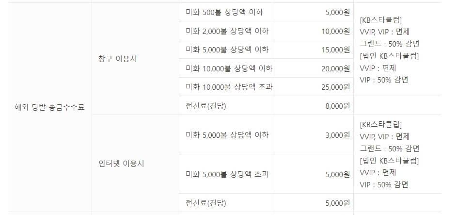 아래는 일례로 국민은행 해외 송금 수수료 표를 첨부해 보았습니다. 이용에 참고하시기 바랍니다.