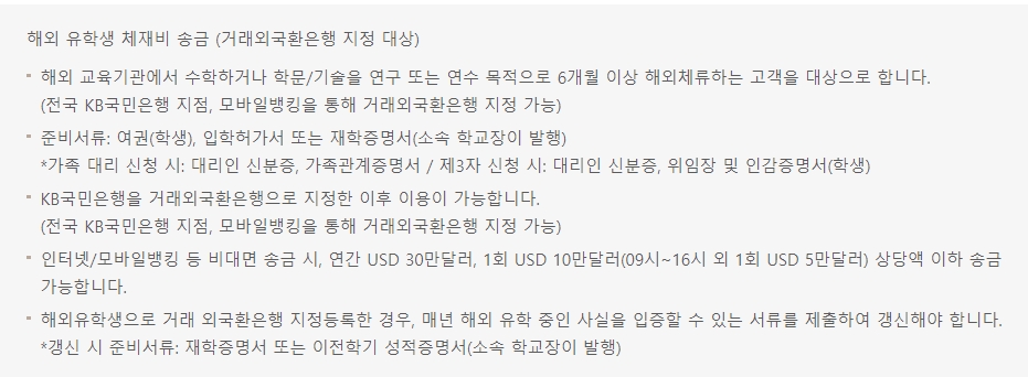 해외 유학생 송금은 해외에 공부를 하러 가는 학생들이 필요로 하는 자금을 위한 송금입니다. 예를 들면, 학비와 용돈, 집 렌트, 기숙사 비용 등을 들 수 있습니다. 기간은 최소 6개월 이상 체류하는 경우에만 해당되며, 은행에서 지정등록 거래를 마친 후에 송금이 가능합니다.