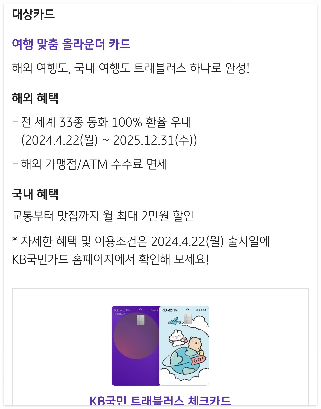국민 트래블러스 체크카드 출시일은 4/22(월)이며, 연회비는 무료입니다. 전세계 33종 통화 100% 환율우대(2024. 4/22~ 2025.12/31)라는 다소 파격적인 마케팅을 내세우고 있습니다.