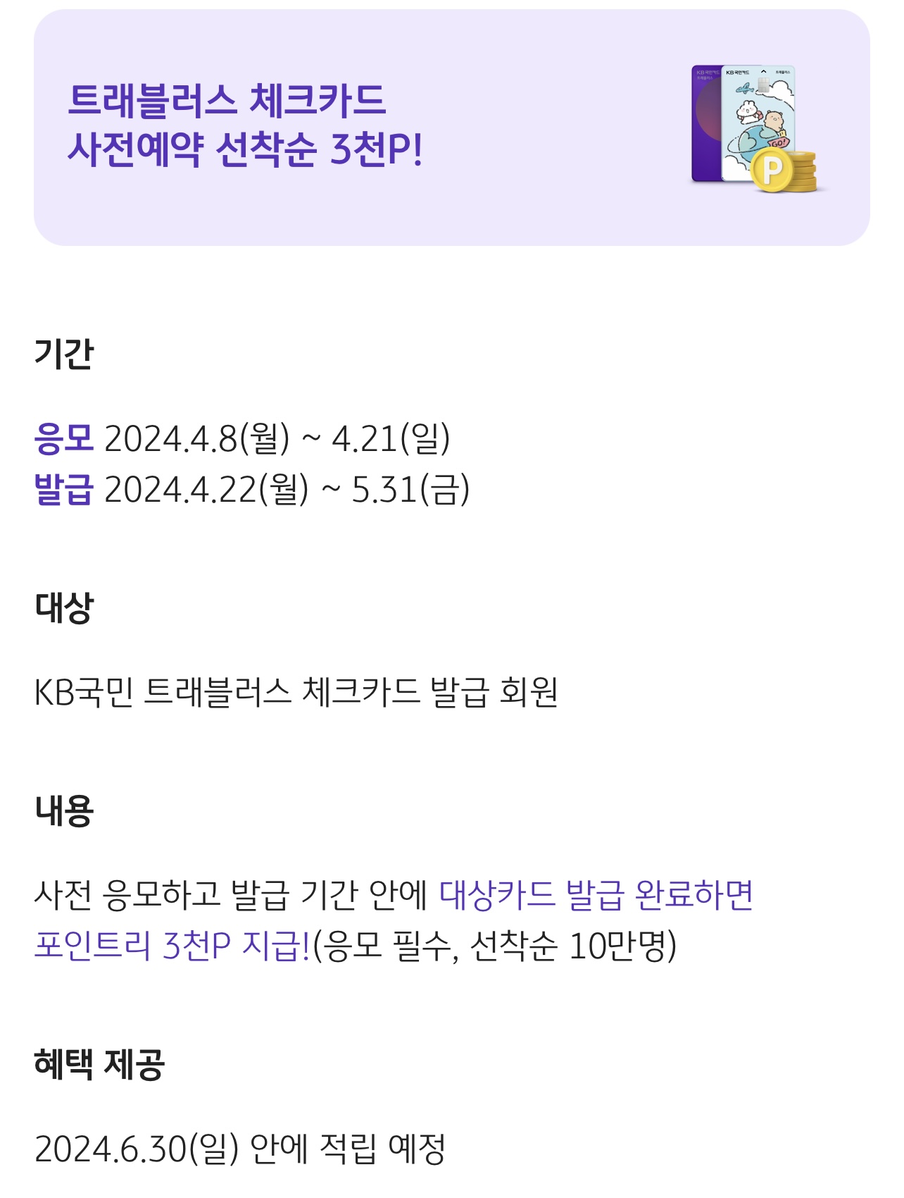 국민 트래블러스 체크카드의 정식 출시일은 4/22(월)입니다. 하지만 이에 앞서 사전에 응모하고 발급 신청을 한 사람을 대상으로 선착순 10만명에게 포인트리 3천 포인트를 지급하는 이벤트를 진행중입니다.