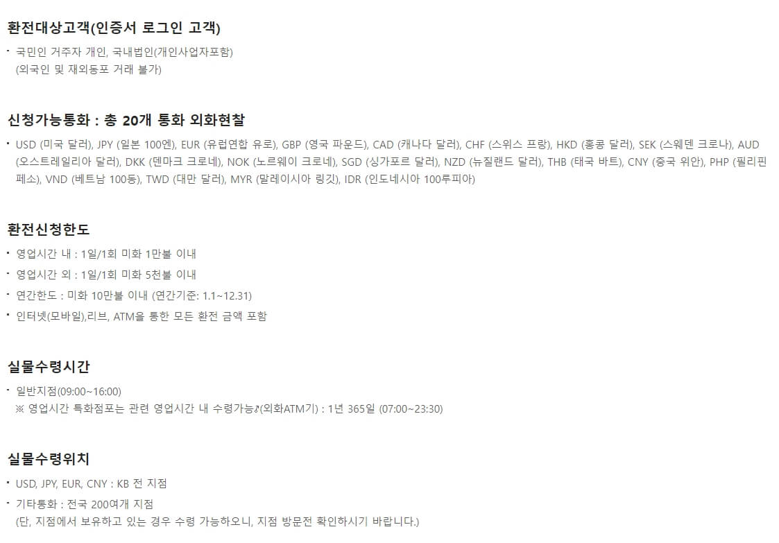 환전 대상고객은 국민인 거주자인 개인과 국내 법인이며, 총 20여개의 외화 현찰이 환전 대상입니다. 환전 신청한도는 개인이 미화 기준 1만불 이내(영업시간 내)이며, 연간한도는 10만 불입니다.