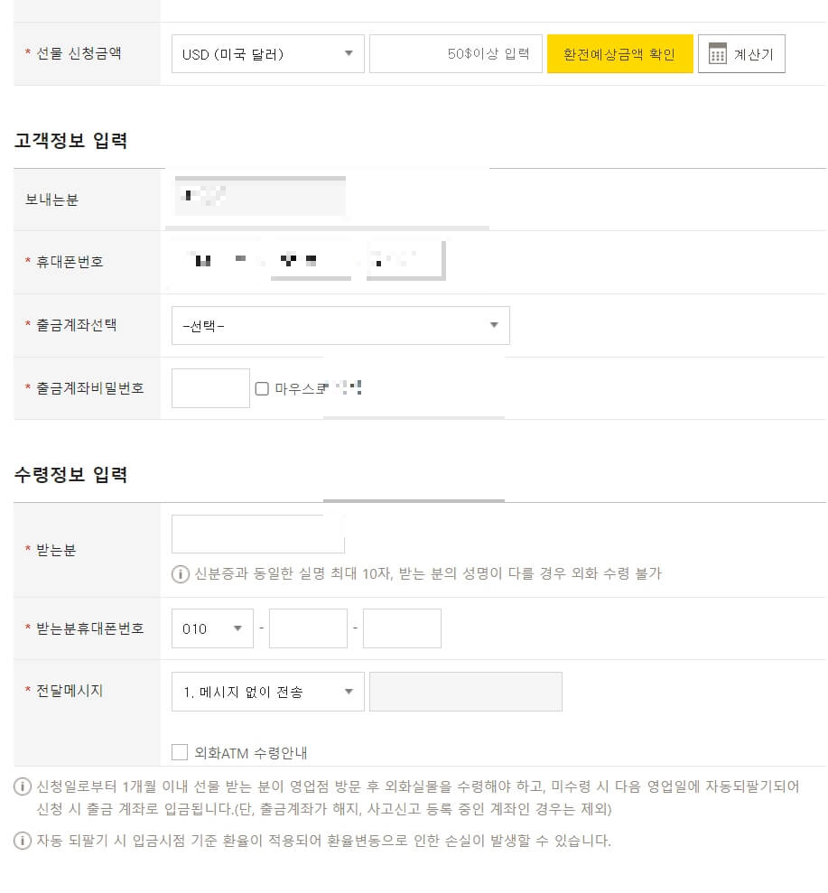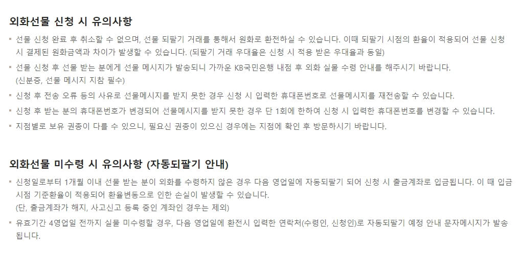 2. 외화를 선물한 후 1개월 이내에 반드시 수령신청을 해야 합니다. 그렇지 않으면 취소가 아닌 되팔기로 진행됩니다. 되팔기가 되면 환율 손해를 볼 수 있으므로 이를 염두에 두셔야 합니다.