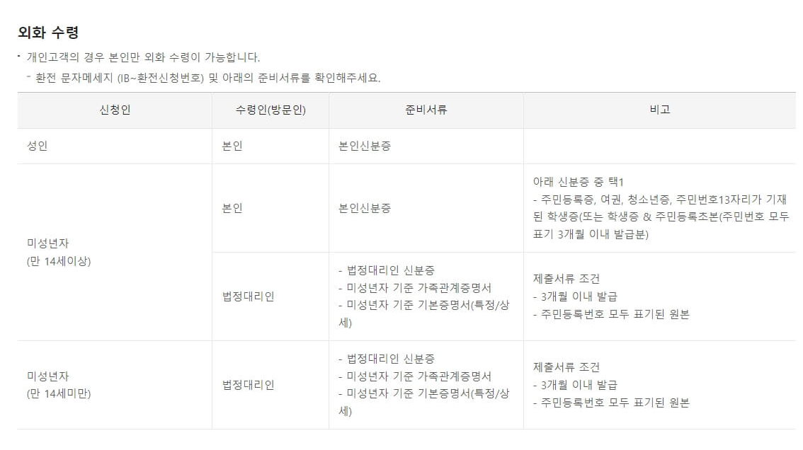대부분의 지점에서 달러, 엔화, 유로, 위안화를 보유하고 있으나, 그 외의 통화 보유 여부는 유선으로 미리 확인하시고 환전 신청을 하시기 바랍니다. 환전 신청한 통화를 받기 위해서는 본인의 신분증과 환전 신청 메시지를 준비하시면 됩니다.