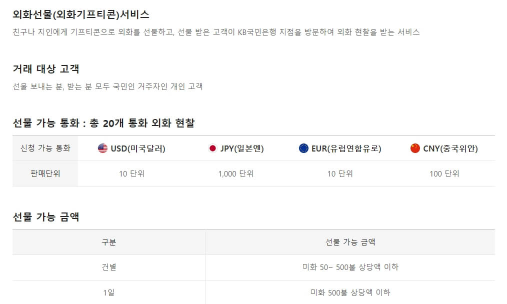 갑자기 부모님이 여행을 가신다고 하거나, 지인이 여행을 간다고 했을 때, 원거리에 있어서 직접 외화 선물을 하지 못했던 경우가 있으셨나요? 이제는 외화도 기프티콘으로 보낼 수 있습니다. 생각보다 간단한 외화 선물 보내는 방법을 지금부터 살펴보겠습니다. 아래의 설명은 국민은행 기준으로 진행됨을 미리 알려드립니다.