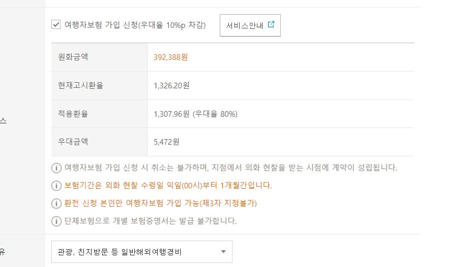 인터넷에서 환전하기를 클릭 한 후 화면에서 여행자 보험 가입하기를 클릭합니다. 여행자 보험 가입 조건은 미화기준 환전 금액이 최소 300불을 충족하셔야 가능하다는 점 기억하세요! 아래는 최소 금액인 300불을 환전했을 때 경우를 산정하여 캡처한 사진입니다.