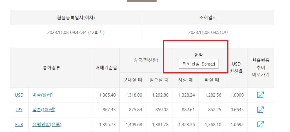 외화현찰 스프레드라고 하는 부분을 클릭하면 다음과 같은 표가 나옵니다. 간단하게 달러, 엔화, 유로 3 가지 통화를 예로 들겠습니다.