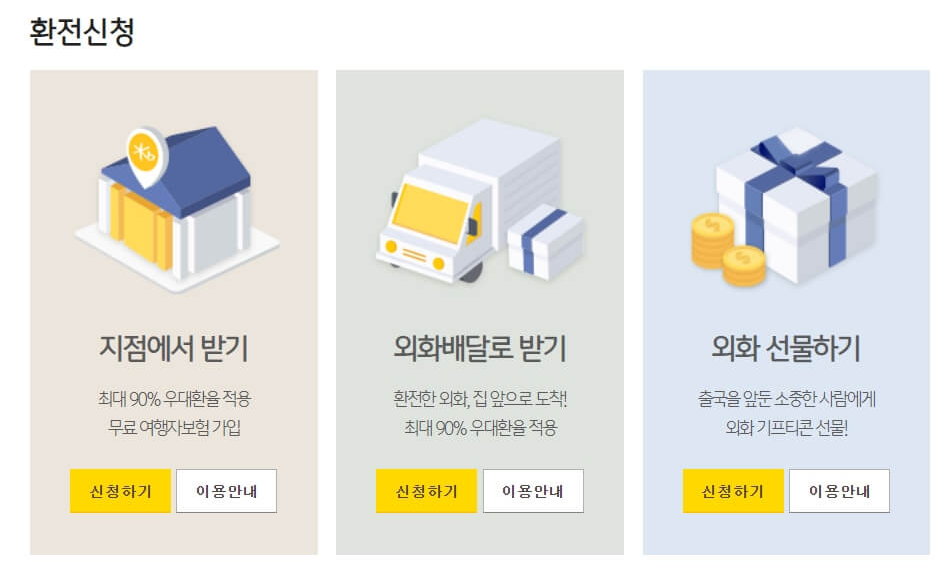 은행의 인터넷 혹은 모바일에서 환전하시면 최대 90% 까지 환율우대가 가능합니다. 수령은 가까운 지점을 선택하셔서 방문하시면 됩니다.