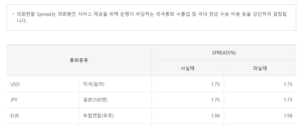 달러와 엔화의 경우에는 스프레드가 1.75%이고 유로의 경우에는 1.98%입니다. 이것이 은행이 현찰로 팔 때의 마진인 것입니다. 우리가 환율 우대를 받는다고 하는 것은 이 스프레드(마진)에서 80%, 90% 할인을 의미하는 것입니다.