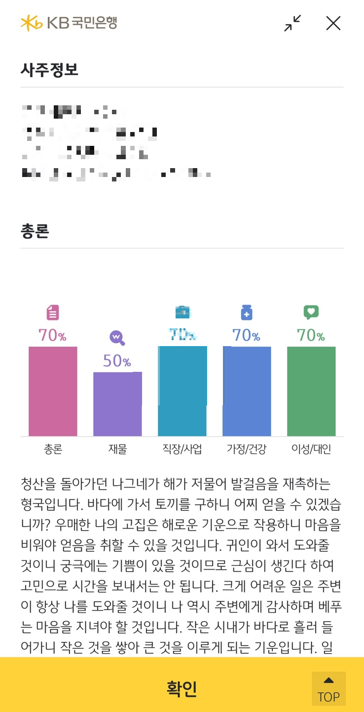 4. KB 운세서비스에서 제공하는 토정비결은 총론, 재물, 직장/사업,가정/건강, 이성/대인 부분으로 나뉘어서 자세하게 풀이해 주기 때문에 내용이 알찬 편입니다. 한 번 신년운세를 확인한 뒤에도 어플에 저장되기 때문에 몇 번이고 다시 확인이 가능합니다.