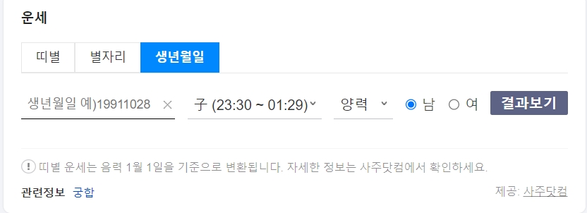 다음에서도 신년운세를 제공하고 있습니다. 네이버와는 다르게, 띠별-별자리-생년월일에 대한 운세를 제공하고 있습니다. 생년월일과 시간을 입력하고 결과보기를 눌러주세요.