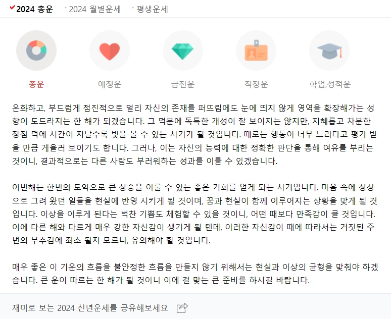 6. 점신에서의 신년 운세는 총운과 풀이, 조언과 월별로 확인이 가능합니다. 작년 결과와 내 후년 결과 미리 보기도 가능해서 꽤 내용이 많은 편입니다. 신년 운세 결과 공유도 가능하니 참고하시기 바랍니다.